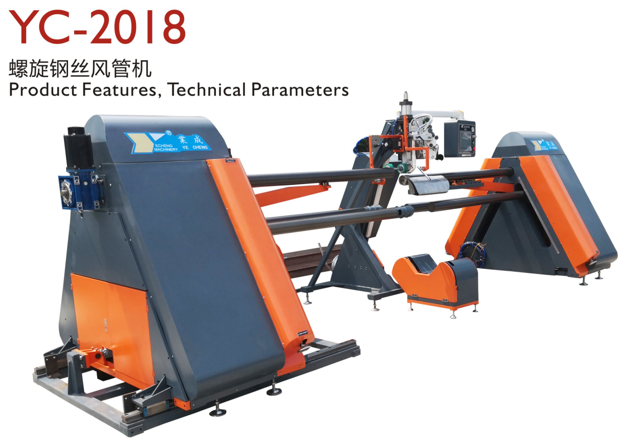 業成牌YC-2018螺旋鋼絲風管機,用于生產負壓通管道,管道直徑為500mm-1000mm,最大成品長度約14米。成品可應用于礦山、隧道等需要負壓通風的場所。設備可實現自動輸送膠帶和鋼絲,熱風焊接,螺距定距等功能。